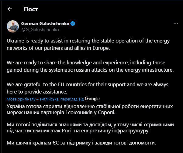 Украина готова помочь Европе, где произошли масштабные отключения электроэнергии, заявил министр энергетики Украины Герман Галущенко.