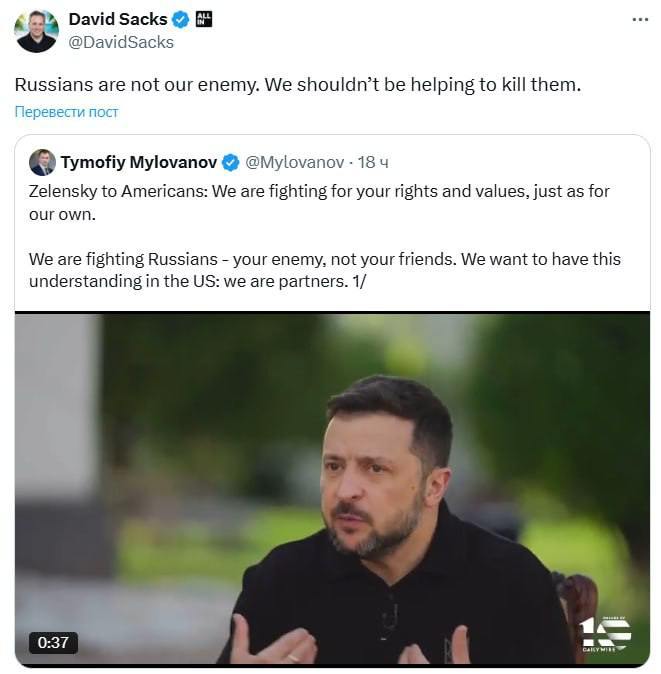 Дэвид Сакс, советник президента США Дональда Трампа, выразил свою позицию в ответ на заявления президента Украины Владимира Зеленского, который утверждал, что Украина ведет войну против «врагов США». Сакс подчеркнул, что «русские нам не враги» и что США не должны помогать в убийстве русских.