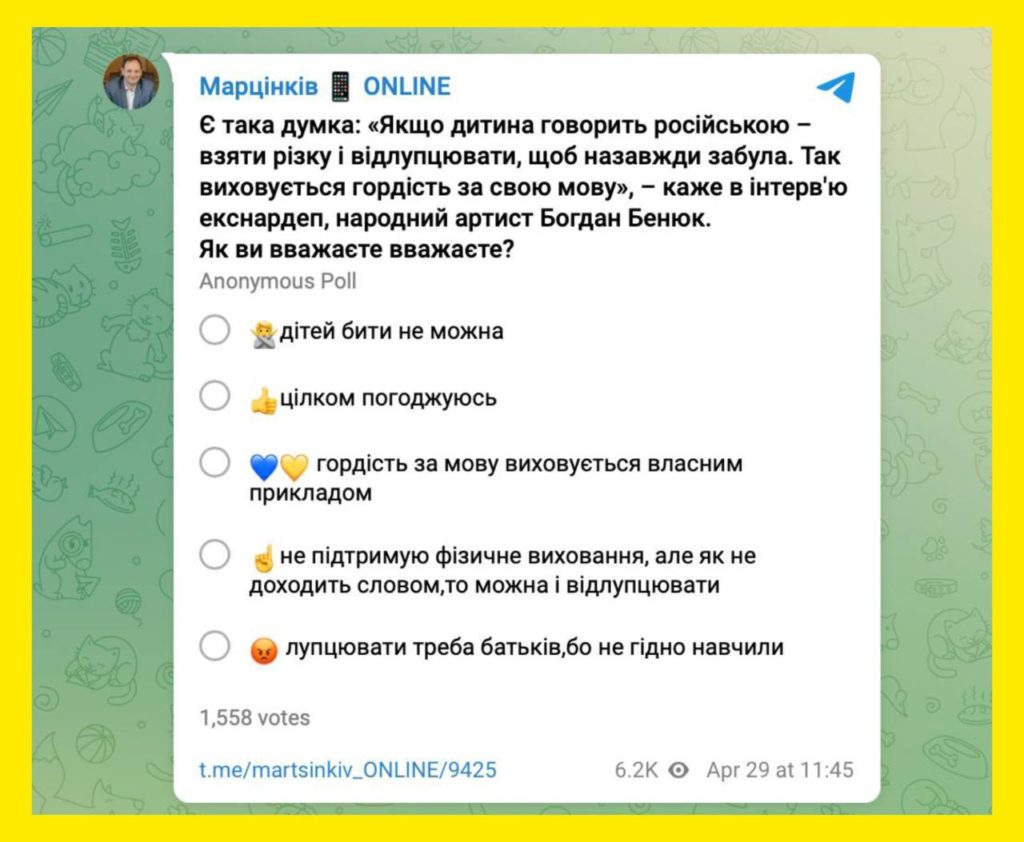 Руслан Марцынкив устроил опрос у себя в Telegram. Он процитировал актера-русофоба Богдана Бенюка, который предложил бить детей, если они говорят на русском языке.