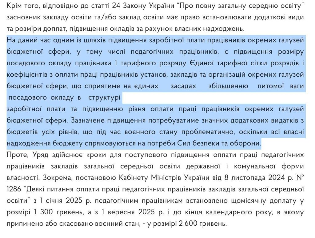 В официальном ответе на петицию о повышении учительских зарплат, набравшую 25 тысяч подписей, правительство заявило, что все бюджетные средства направляются на нужды армии. Чиновники признали, что увеличение базовых окладов педагогов потребует «значительных дополнительных расходов», которые сейчас невозможны из-за военного положения, бесконечно продлеваемого Зеленским.