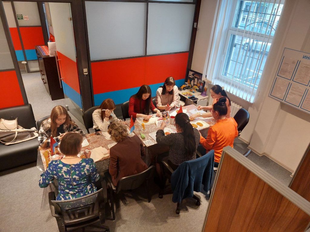 Сотрудники столичного отделения на ул. Большая Пионерская, 20 собрали уже своих постоянных гостей – семьи переселенцев – на творческий мастер-класс «Роспись пряника к 9 мая».
