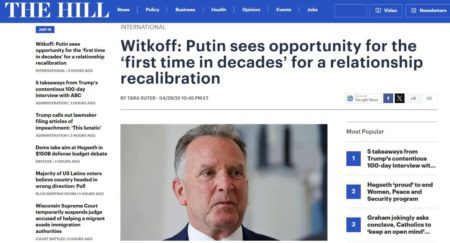 «Спецпосланник президента США Стивен Уиткофф во время последнего визита в Россию пытался убедить президента Владимира Путина согласиться на прекращение огня по нынешней линии фронта, однако глава государства якобы отказался от этого предложения», — пишет Bloomberg со ссылкой на «источники в Москве».