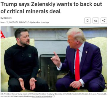 «Сделка по минералам и мирные усилия США обсуждались отдельно, но отражают подход Вашингтона к Украине и России. Трамп перевернул политику США, смягчив позицию США в отношении России и иногда ложно обвиняя в войне президента Украины Владимира Зеленского», — подводят итог журналисты.