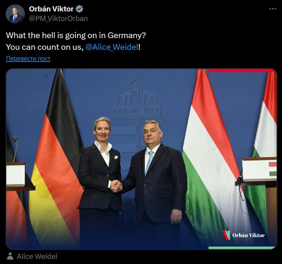 «Что, черт возьми, происходит в Германии? Алиса Вайдель, вы можете рассчитывать на нас!», — написал Орбан в соцсетях.