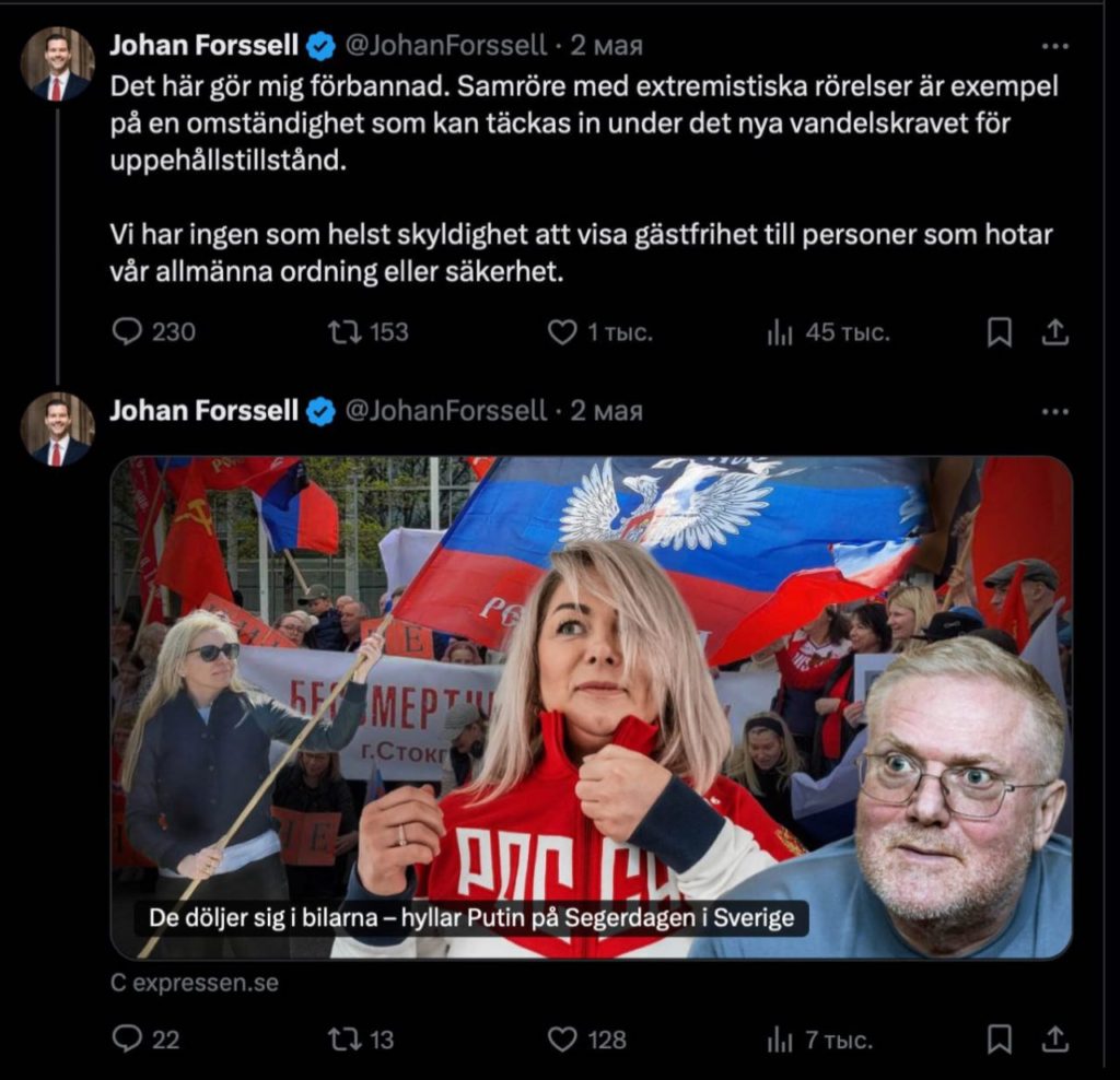Швеция лишит вида на жительство и депортирует из страны всех, кто участвует в автопробеге в Стокгольме в честь 9 мая. С такой угрозой выступил министр по вопросам миграции Йохан Форсселль.