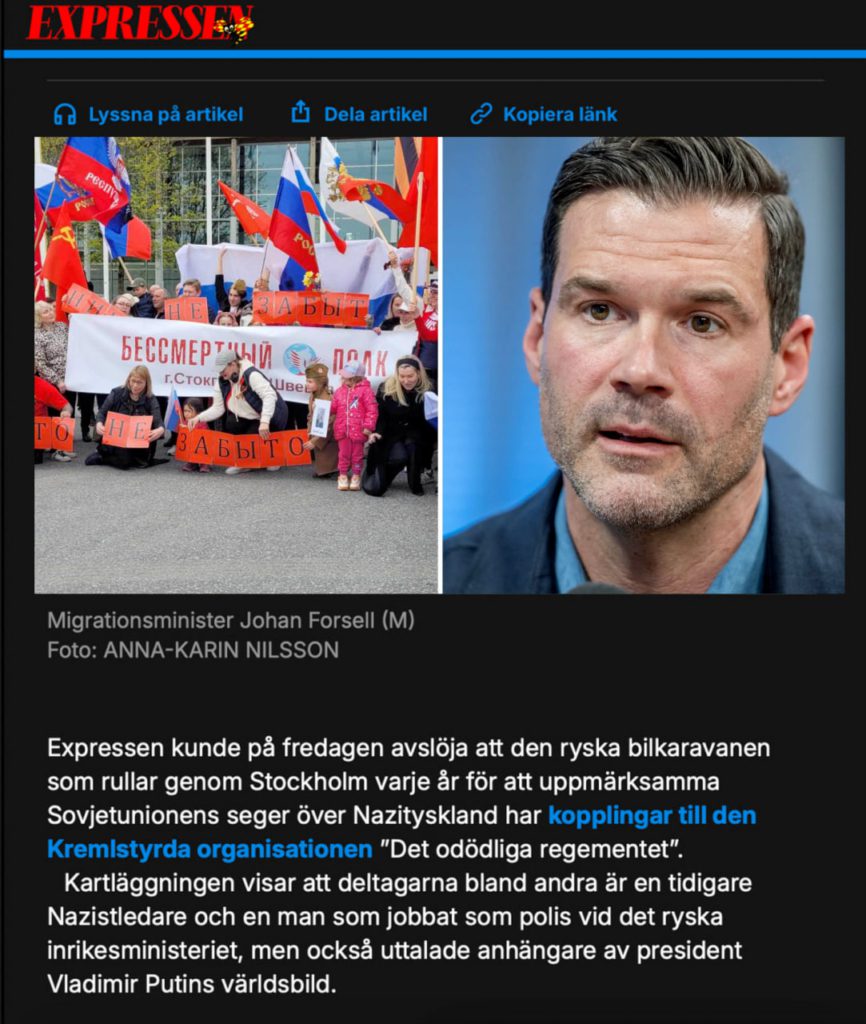 Шведская Expressen с гордостью подхватывает: «Министр пришел в ярость» после «расследования», которое провела эта газета. Она утверждает, что ежегодный российский автопробег, который проходит через Стокгольм в честь победы СССР над нацистской Германией, связан с организацией «Бессмертный полк», которую «контролирует Кремль».
