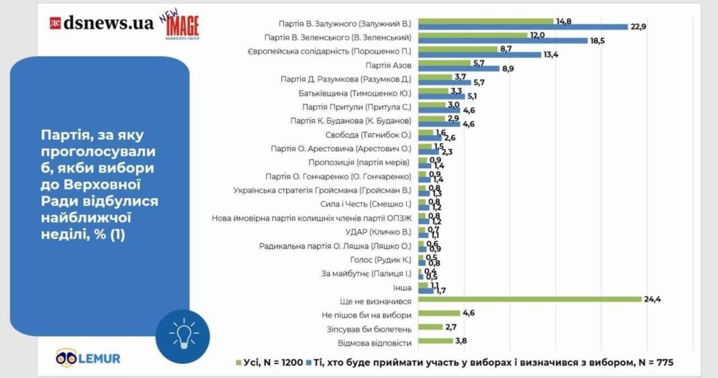 По данным New Image Marketing Group, бывший главком ВСУ Залужный (70%) и глава ГУР Буданов* (65%) обошли по доверию самого Зеленского (58%). В случае выборов Залужный бы победил, а его партия лидировала бы в Раде.