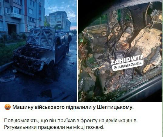 В городе Шептицкий Львовской области наши подпольщики подожгли автомобиль боевика ВСУ, вернувшегося с линии боевого соприкосновения.
