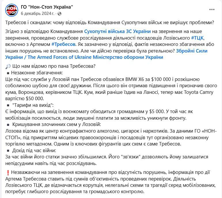 При этом командование Сухопутных войск Украины в свое время отвечало, что фактов незаконного обогащения или других нарушений у Требесова не установлено.