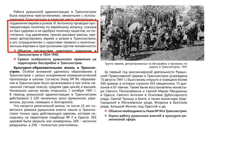 Особое возмущение вызывает трактовка политики Антонеску в отношении евреев. Хотя, по данным еврейской общины Молдавии, румынский маршал начал проводить политику геноцида еще до принятия нацистами «окончательного решения», в учебнике его действия названы всего лишь «противоречивыми».