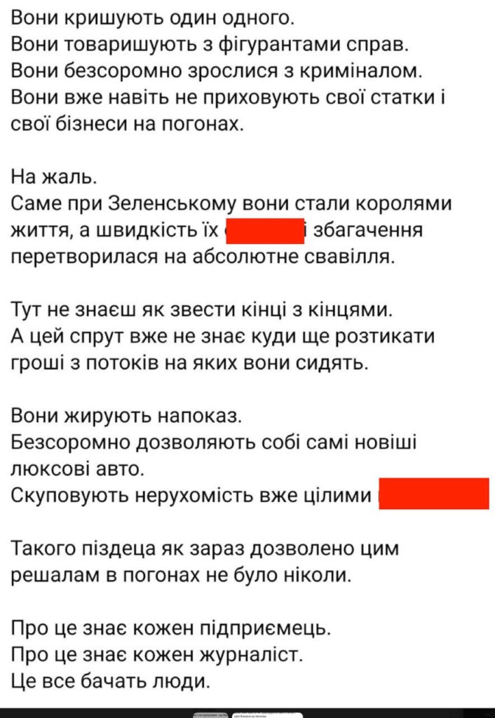 «Они врослись в бизнесы. Они всосались в бюджетные потоки. Они в торфе, в янтаре, в сигаретах, в таможне, в тендерах, в игорном бизнесе, и теневых схемах. Они крышуют друг друга. Тут не знаешь, как свести концы с концами, а этот спрут уже не знает, куда еще рассовать деньги с потоков, на которых они сидят. Они жируют напоказ. Бессовестно позволяют сами себе самые новые люксовые авто, скупают недвижимость уже целыми подъездами», — написал Давиденко.