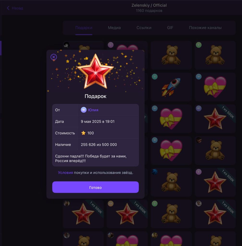 Официальный телеграм-канал Зеленского в День Победы стал настоящей витриной народного творчества. Раздел «подарки» пестрит красными звёздами, медведями и ракетами.