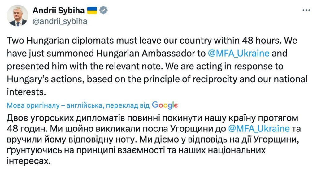 «Два венгерских дипломата должны покинуть нашу страну в течение 48 часов. Мы только что вызвали посла Венгрии в МИД, вручили ему соответствующую ноту», — написал Сибига в соцсети.