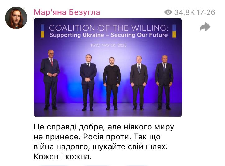 «Это действительно хорошо, но никакого мира не принесет. Россия против. Так что война надолго, ищите свой путь. Каждый», — написала Безуглая в своем Телеграм-канале, комментируя итоги переговоров в Киеве так называемой «коалиции желающих».