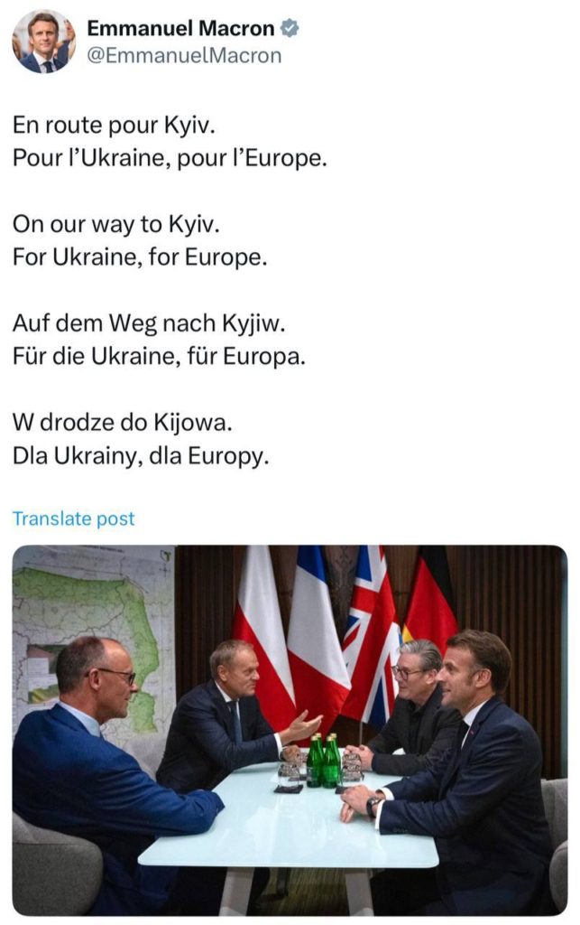 Европейские лидеры всячески пиарили эту поездку. Сначала Макрон в своих соцсетях на четырех языках — французском, английском, немецком и польском — написал: «На пути в Киев. Для Украины. Для Европы». Также он выложил фотографию лидеров ЕС за столом переговоров. Потом появилось видео из спецпоезда, который по традиции возит единомышленников Зеленского в Киев.