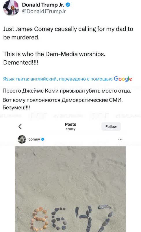 Бывший сотрудник спецслужб США Джеймс Коми опубликовал в соцсетях фото с ракушками, выложенными в виде чисел «86» и «47».