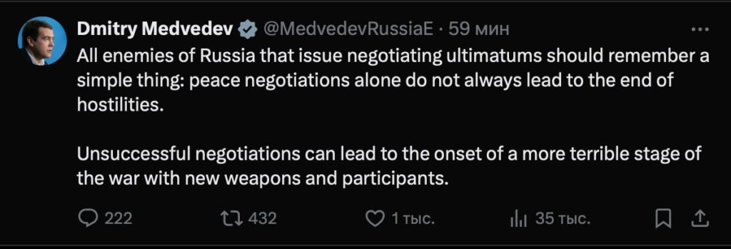 «Всем врагам России, выдвигающим ультиматумы о переговорах, следует запомнить простую вещь: мирные переговоры сами по себе не всегда приводят к окончанию боевых действий. Неудачные переговоры могут привести к началу более ужасной стадии войны с новым оружием и участниками», — написал Медведев.