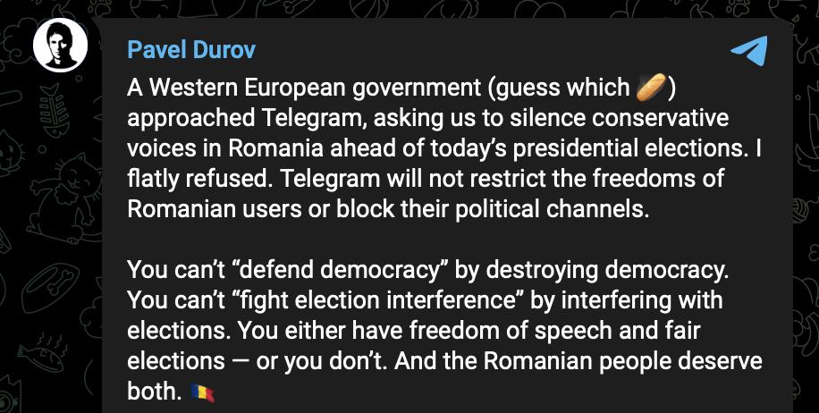 «Западноевропейское правительство (угадайте какое?) обратилось с просьбой заставить замолчать консервативные голоса в Румынии перед сегодняшними президентскими выборами. Я категорически отказался», — сообщил Дуров, добавив эмодзи багета к вопросу о названии страны.
