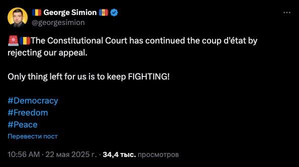 Экс-кандидат в президенты Румынии Джордже Симион назвал отказ Конституционного суда отменить итоги второго тура выборов государственным переворотом.