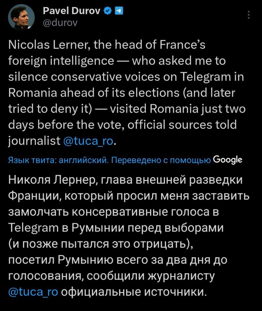 «Мы сделаем все возможное на местах, чтобы гарантировать, что следующий президент Румынии будет проевропейски настроенным, — заявила агентству France Info 10 мая 2025 года ближайшая соратница Макрона и ключевой член партии Валери Айер. Так что же глава французской разведки делал в Румынии через несколько дней после этого обещания?» — написал Павел Дуров.