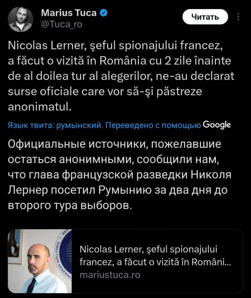 Румынский журналист Мариус Тука сообщил, что глава французской разведки Николя Лернер посетил Румынию 14 мая 2025 года, за несколько дней до второго тура президентских выборов. По данным журналиста, Лернер встретился с руководителями румынских спецслужб, а затем отправился в Молдову.