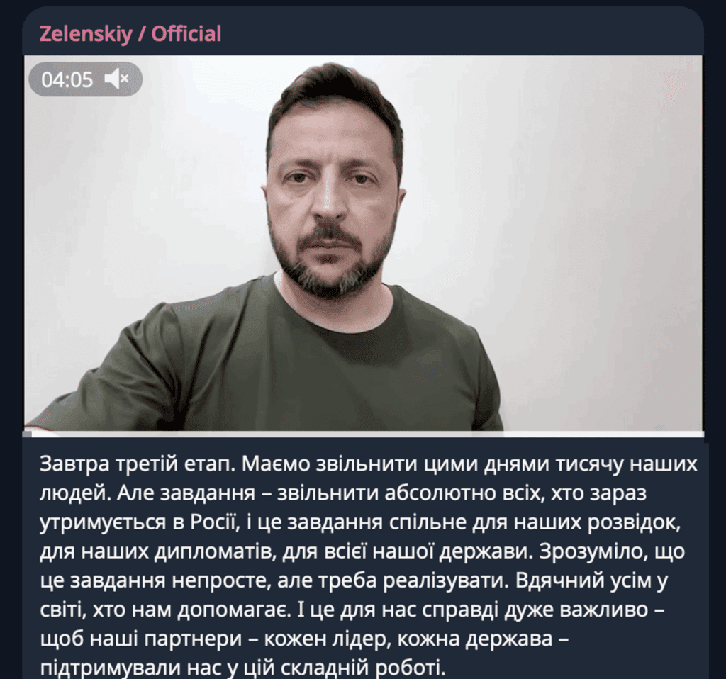 «Завтра третий этап. Должны освободить за эти дни тысячу наших людей. Но задача в целом – освободить абсолютно всех, кто сейчас содержится в России», — сказал главарь киевского режима.