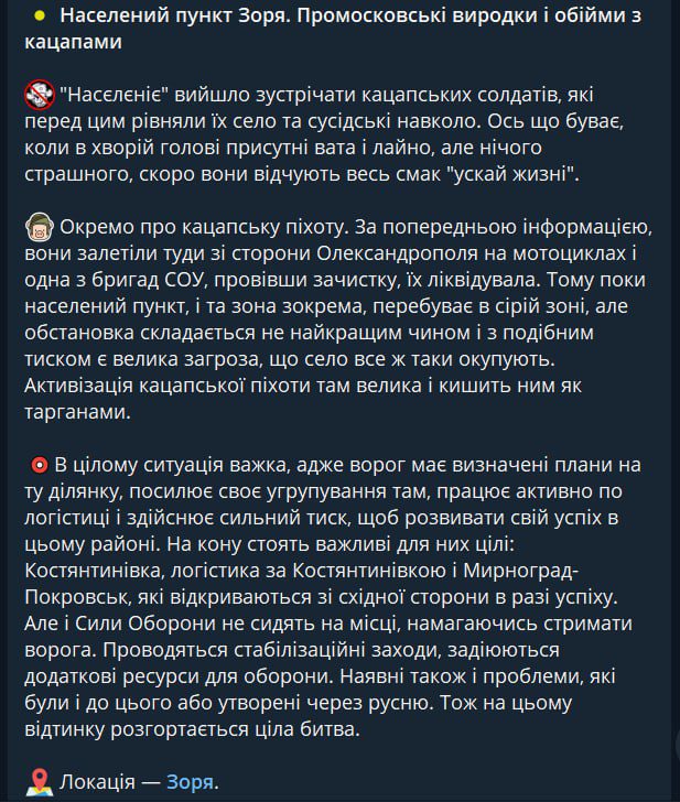 Сообщается, что подразделение ВС РФ вошло в село Заря на фронтовой линии между Дзержинском (Торецком) и Красноармейском (Покровском), где их встречали объятиями местные жители.