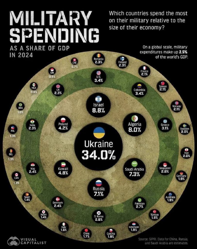 Израиль на втором месте тратит заметно ниже — 8,8%, Саудовская Аравия — 7,3%, а уж Россия, по мнению западных экспертов — 7,1%. США и вовсе 3,4%.