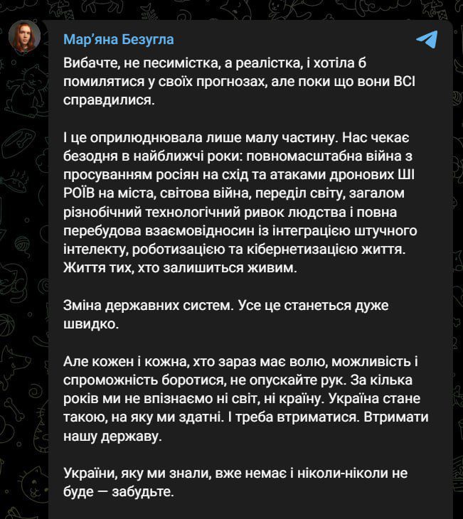«Нас ждет бездна в ближайшие годы: полномасштабная война с продвижением русских на восток и атаками роев ИИ-дронов на города, мировая война, передел мира, в целом разносторонний технологический рывок человечества и полная перестройка взаимоотношений с интеграцией искусственного интеллекта, роботизацией и кибернетизацией жизни. Жизнь тех, кто останется живым», — написала Безуглая в соцсетях.