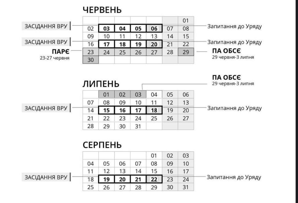 Согласно утверждённому графику, украинские парламентарии отдыхают три недели в начале лета — с июня по июль, а затем ещё целых четыре недели — с июля по август. Всего семь недель летних каникул.