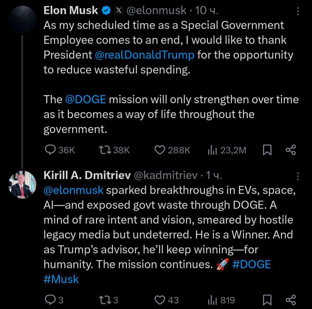 Руководитель Российского фонда прямых инвестиций Кирилл Дмитриев прокомментировал завершение полномочий Илона Маска на посту главы Департамента эффективности правительства США.