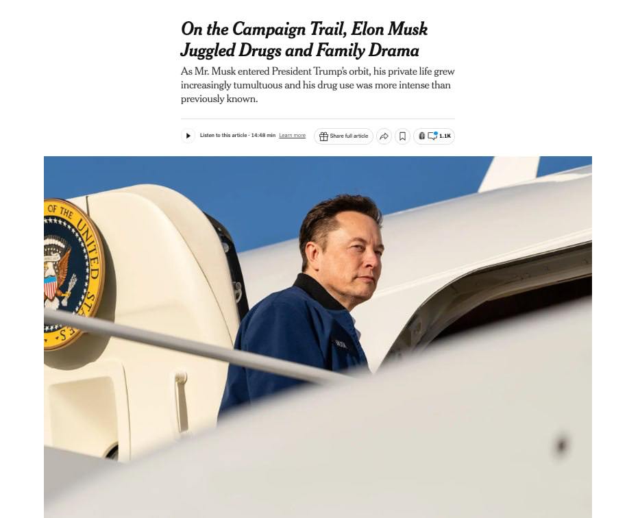 По данным The New York Times, миллиардер Илон Маск регулярно употреблял кетамин, экстази и психоделические грибы в течение предвыборной кампании Дональда Трампа.
