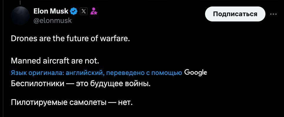 «Беспилотники — это будущее войны. Пилотируемые самолёты — нет», — заявил предприниматель.
