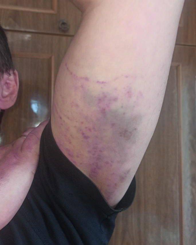 Только после того, как он пригрозил вскрыть себе вены, его отпустили в больницу. Диагноз — ушибленная лопатка, синяки, травма шеи.