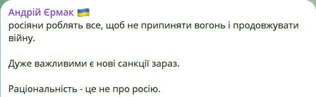 «Россияне делают все, чтобы не прекращать огонь и продолжать войну. Очень важны новые санкции сейчас. Рациональность – это не о России», – написал он.
