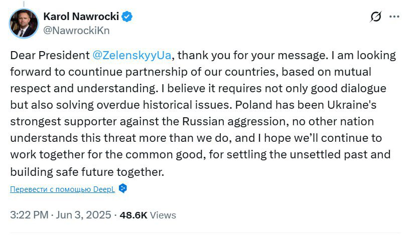 Президент Польши Кароль Навроцкий уже на следующий день после избрания указал Зеленскому на необходимость решить «давно назревшие исторические вопросы» в ответ на его поздравление с победой.