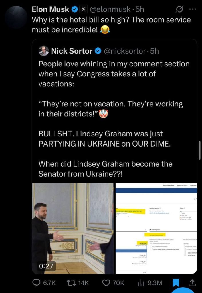Миллиардер Илон Маск раскритиковал сенатора-республиканца Линдси Грэма*, заявив, что тот потратил $400 тысяч государственных средств всего за один месяц на проживание в отеле в Киеве и другие поездки.