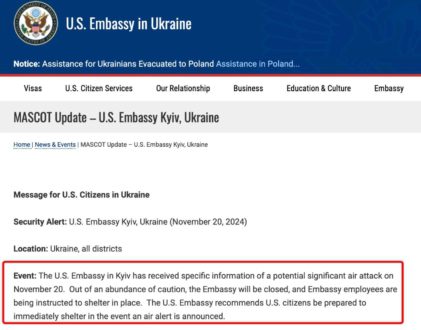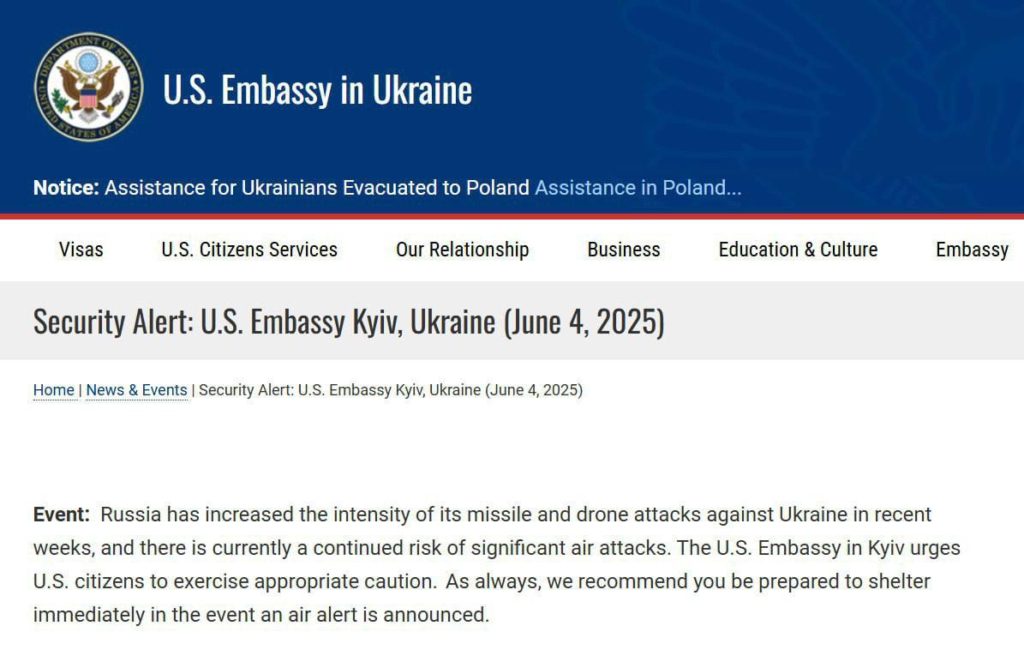 В заявлении посольства говорится: «Россия увеличила интенсивность своих ракетных и беспилотных атак против Украины в последние недели, и в настоящее время сохраняется риск значительных воздушных атак. Посольство США в Киеве призывает граждан США проявлять соответствующую осторожность. Как всегда, мы рекомендуем вам быть готовыми немедленно укрыться в случае объявления воздушной тревоги».