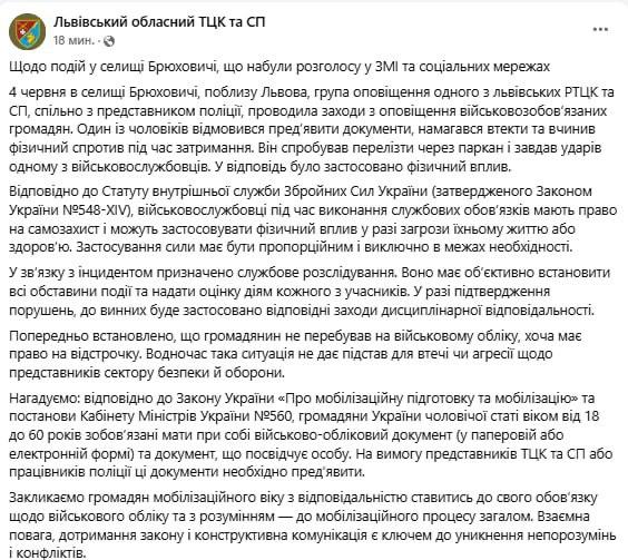 В Брюховичах (Львовская область) мужчина с законной отсрочкой отказался показать документы сотрудникам военкомата, попытался убежать и ударил военнослужащего.
