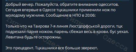 Как сообщают местные источники, накануне вечером в районе Таирова один из ТЦКшников ударил ножом молодого мужчину, попытавшегося избежать насильственного задержания.