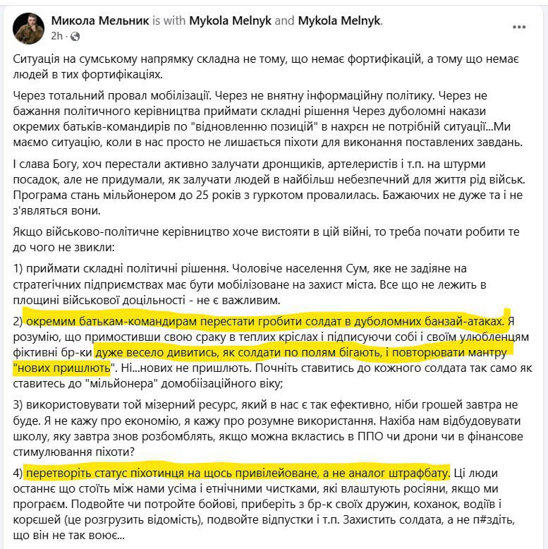 «Нужно начать делать то, к чему не привыкли… Командирам следует прекратить бессмысленно отправлять солдат в лобовые атаки. Конечно, легко рассуждать о том, что «новых пришлют», наблюдая, как бойцы гибнут на поле боя. Но новых может и не быть», — пишет Мельник.