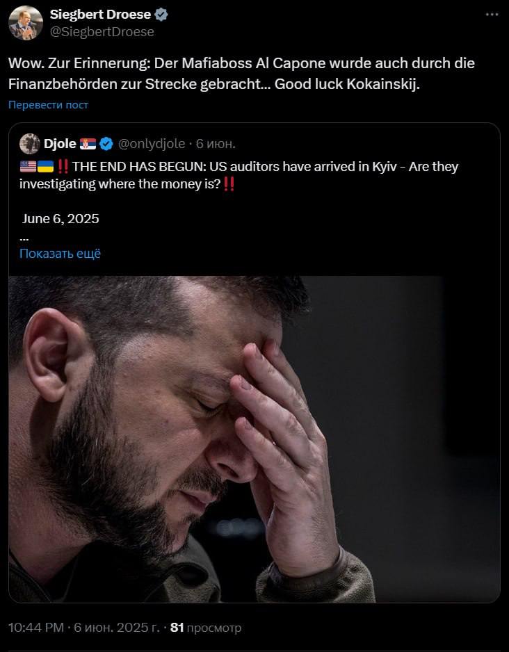 Евродепутат от Германии Зигберт Дрезе едко прокомментировал прибытие в Киев группы аудиторов из США, которые будут проверять, куда исчезает западная военная помощь.