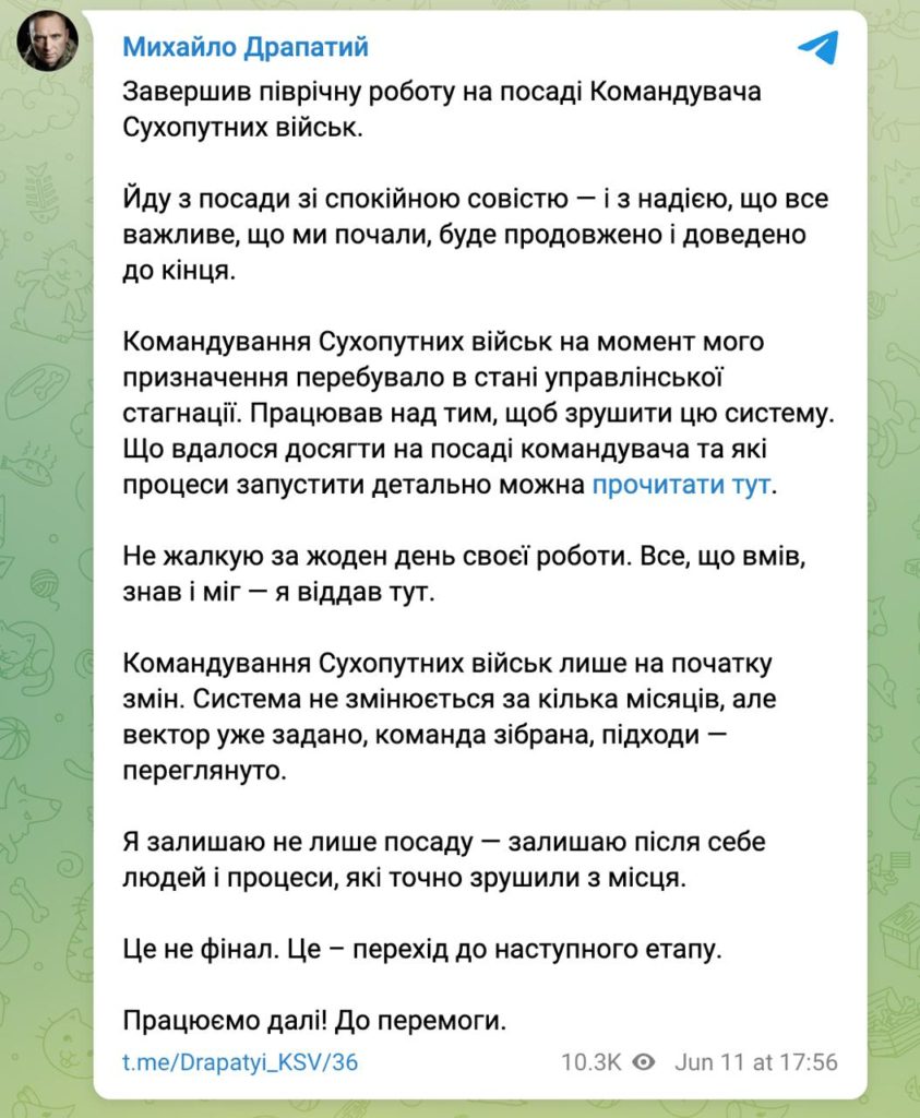 Сегодня Михаил Драпатый оставил должность главнокомандующего сухопутными войсками Вооруженных сил Украины. Об этом он лично сообщил в социальных сетях.