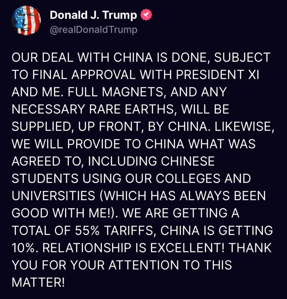 В своём сообщении в соцсети TruthSocial Трамп уточнил детали сделки: Китай обязуется заранее поставить полный объём магнитов и все необходимые редкоземельные элементы, а США, в обмен, обеспечат договорённые позиции, включая образовательные программы для китайских студентов.