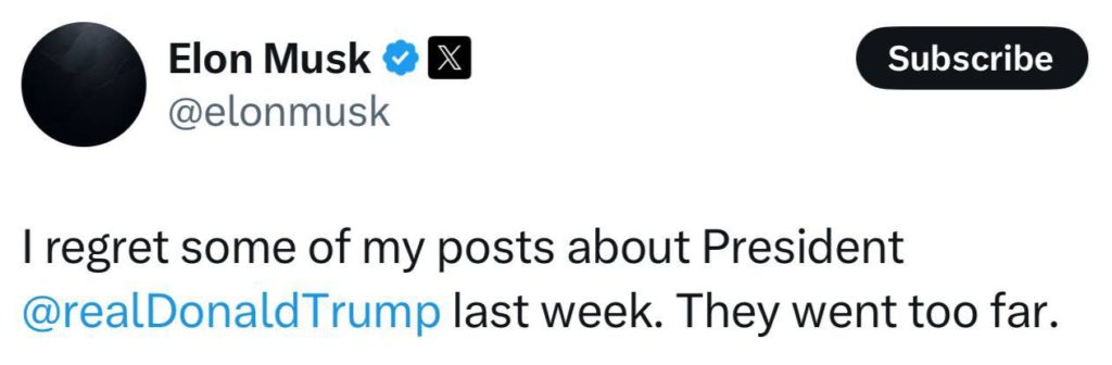 «Я сожалею о некоторых моих постах о президенте Трампе на прошлой неделе. Они зашли слишком далеко», – раскаивается миллиардер.