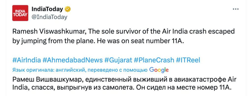 ANI ссылкой на комиссара полиции Ахмедабада Гьянендру Сингха Малика написало, что были обнаружены два выживших при крушении самолета. Затем агентство уточнило, что найден один человек, а не двое, как сообщалось ранее.