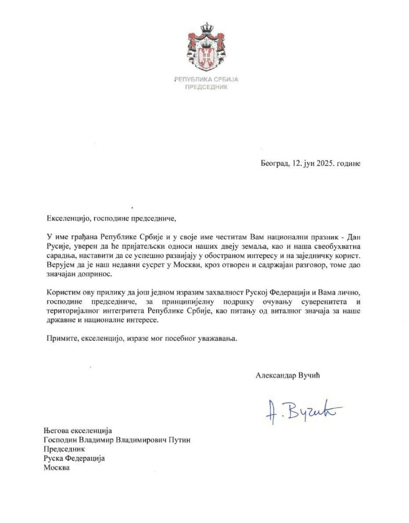 «Поздравляю вас с национальным праздником — Днём России, уверен, что дружественные отношения между нашими странами, а также наше всестороннее сотрудничество будут и дальше успешно развиваться в интересах обеих сторон и на общее благо. Пользуясь случаем, хочу ещё раз выразить благодарность России и лично вам, господин Президент, за принципиальную поддержку сохранения суверенитета Сербии», — говорится в поздравлении.