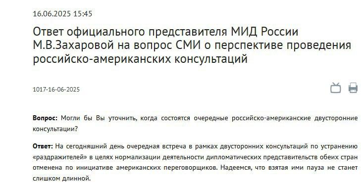 «На сегодняшний день очередная встреча в рамках двусторонних консультаций по устранению «раздражителей» в целях нормализации деятельности дипломатических представительств обеих стран отменена по инициативе американских переговорщиков. Надеемся, что взятая ими пауза не станет слишком длинной», — сказала Захарова.