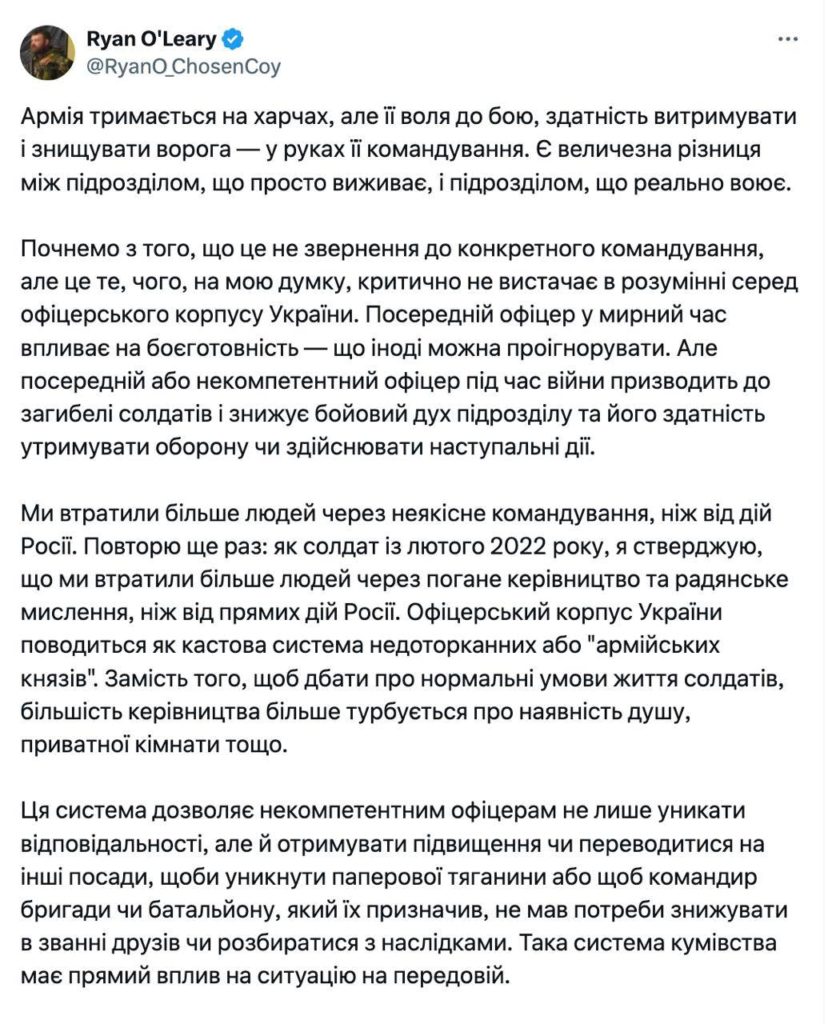 «С февраля 2022 года я видел, как больше солдат гибло из-за откровенно глупых решений офицеров, чем от действий российской армии. Украинский офицерский корпус — это кастовая система «армейских князей», где кумовство и безответственность важнее боеспособности», — сообщил он.