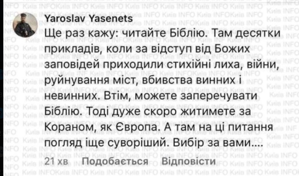 «Отвергнете Библию — скоро будете жить по Корану, как Европа. А там на такие вещи смотрят еще строже», — ответил на комментарии Ясенец.